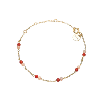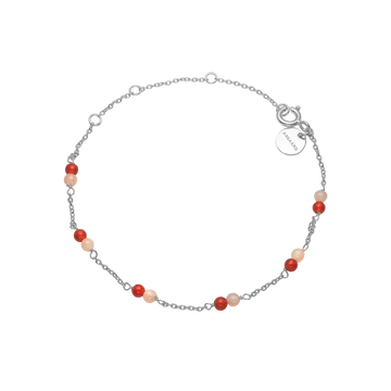 Armbåndet prydes af en kombination af agat og månesten, der er smukt sat sammen med fine kædeled. De to sten gentages i et elegant mønster, hvilket giver et sofistikeret og moderne look.