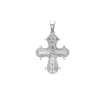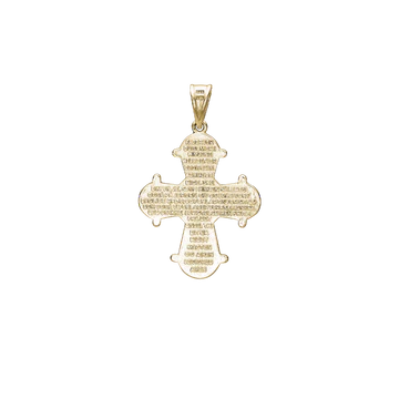 Korset har en detaljeret udformning med Fadervor indgraveret på bagsiden og måler 19x23 mm, hvilket gør det ideelt som vedhæng til en halskæde.