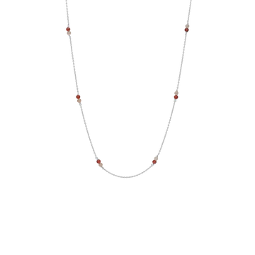 Med et unikt design, hvor en agat og en månesten er forbundet af små kædestykker, skabes en harmonisk og raffineret kæde, der måler 45 cm i længden.