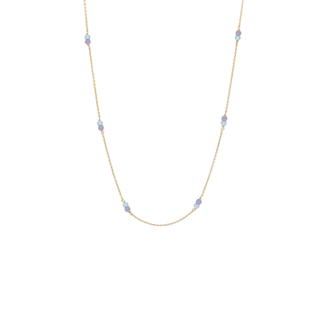 Designet er en harmonisk sammensætning af ædelsten: en ametyst og en blå kvarts er parvis sat sammen, efterfulgt af et kædestykke, og mønstret gentager sig videre langs kæden.