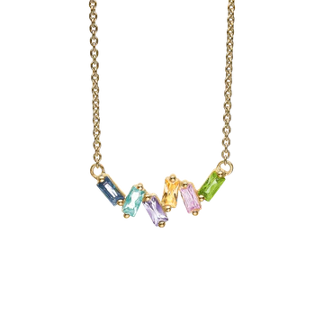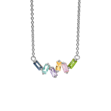 Halskæden er tilgængelig i både sølv 925 og forgyldt sølv 925, og den er udsmykket med 6 rektangulære zirkonia-sten i forskellige farver, der tilfører et strejf af elegance og farve til dit look.