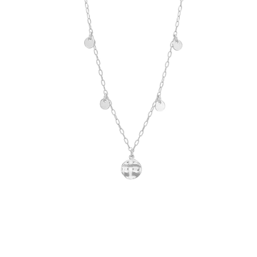 Denne halskæde har en elegant kæde på 45 cm, hvor flere glatte mønter hænger smukt i en asymmetrisk stil. I midten pryder en større mønt med en banket, struktureret overflade, som giver et sofistikeret look.