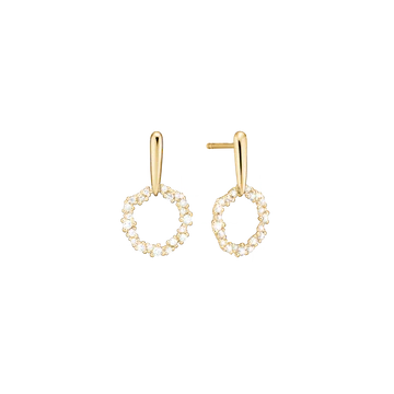 Disse smukke ørehængere er fremstillet i forgyldt sølv og prydet med glitrende zirkonia-sten i forskellige størrelser, arrangeret i en elegant cirkel.
