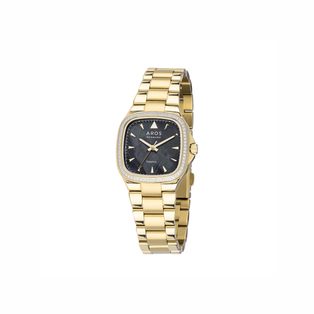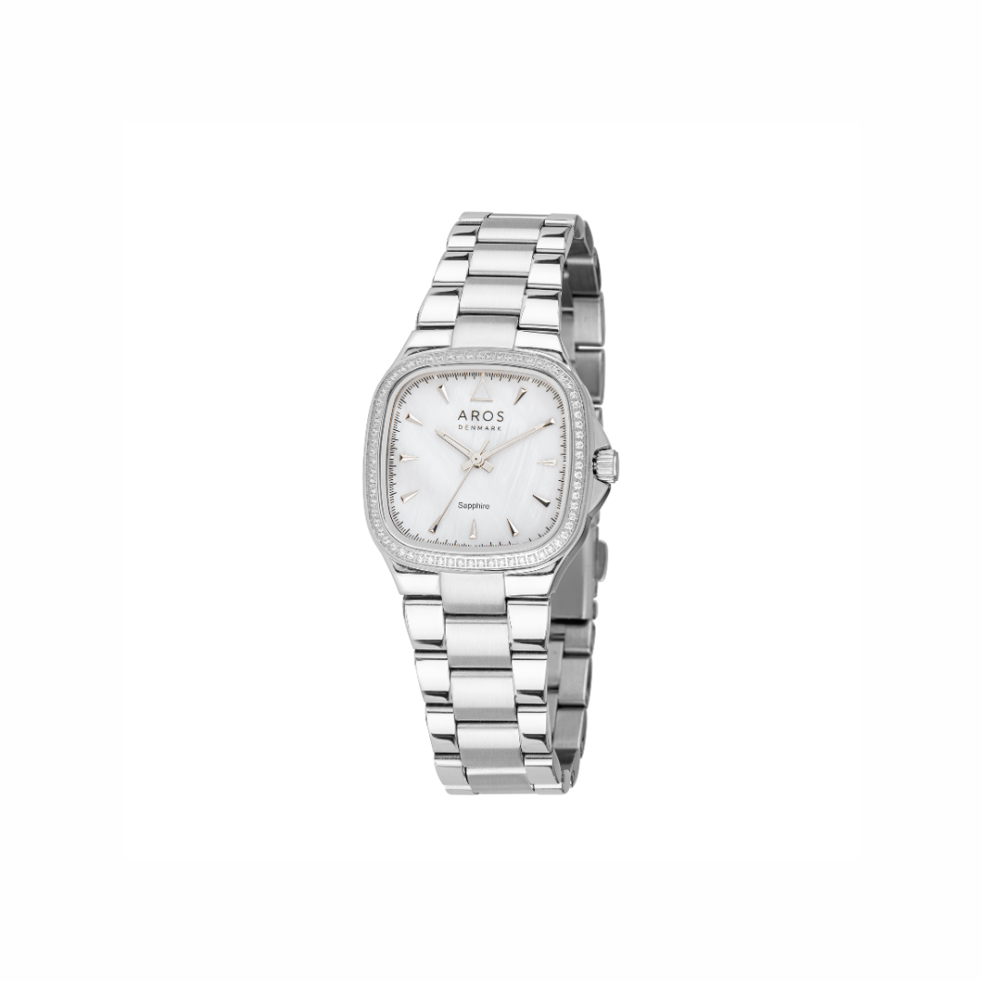 Dette elegante dameur fra AROS kombinerer stil og funktionalitet med sit robuste rustfri stål-lænke, ridsefaste safirglas og vandtæthed op til 5 ATM. Uret fås i stål m. hvis urskive og gulddouble m. sort urskive. Uret har et klassisk analogt design med tydelige markeringer og praktisk datovisning – perfekt til både hverdag og formelle anledninger.