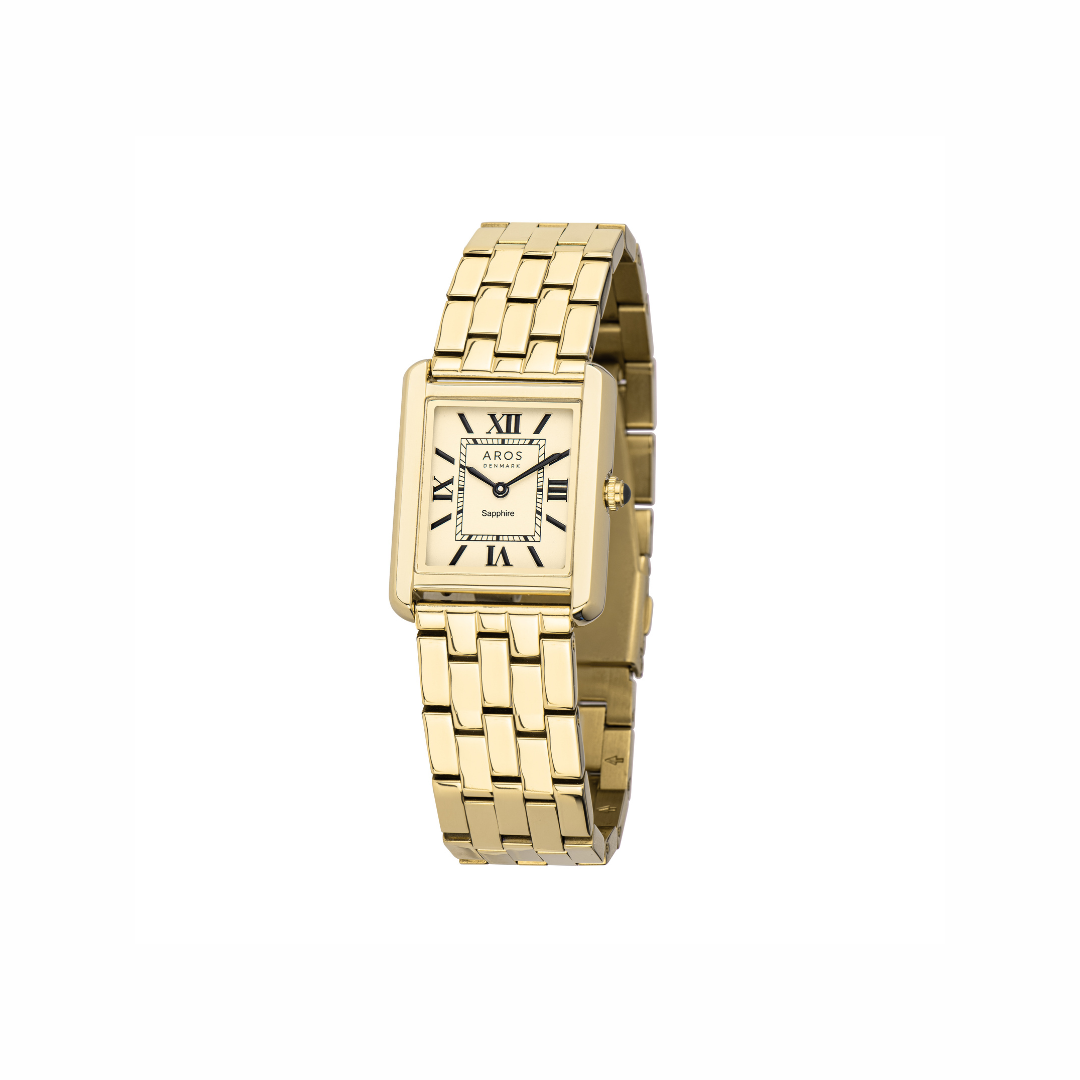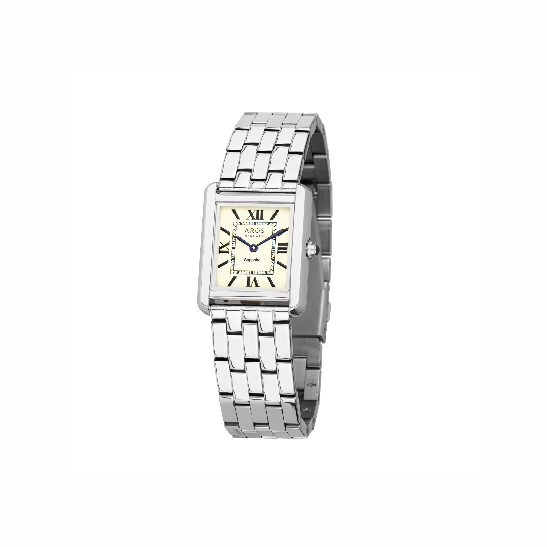 Forkæl dig selv eller en du holder af med dette elegante dameur fra AROS. Uret er fremstillet i holdbart rustfrit stål og kombinerer et tidløst design med funktionelle detaljer. Den rektangulære urskive er beskyttet af slidstærkt safirglas, som sikrer optimal modstand mod ridser.