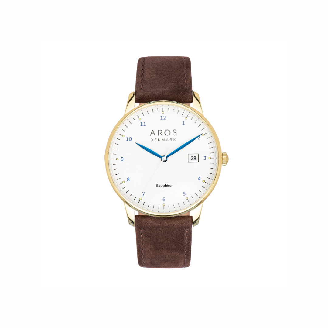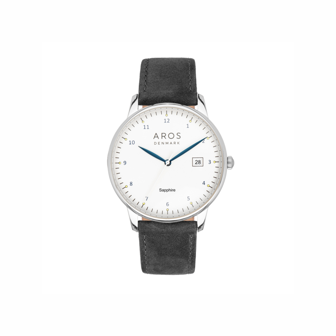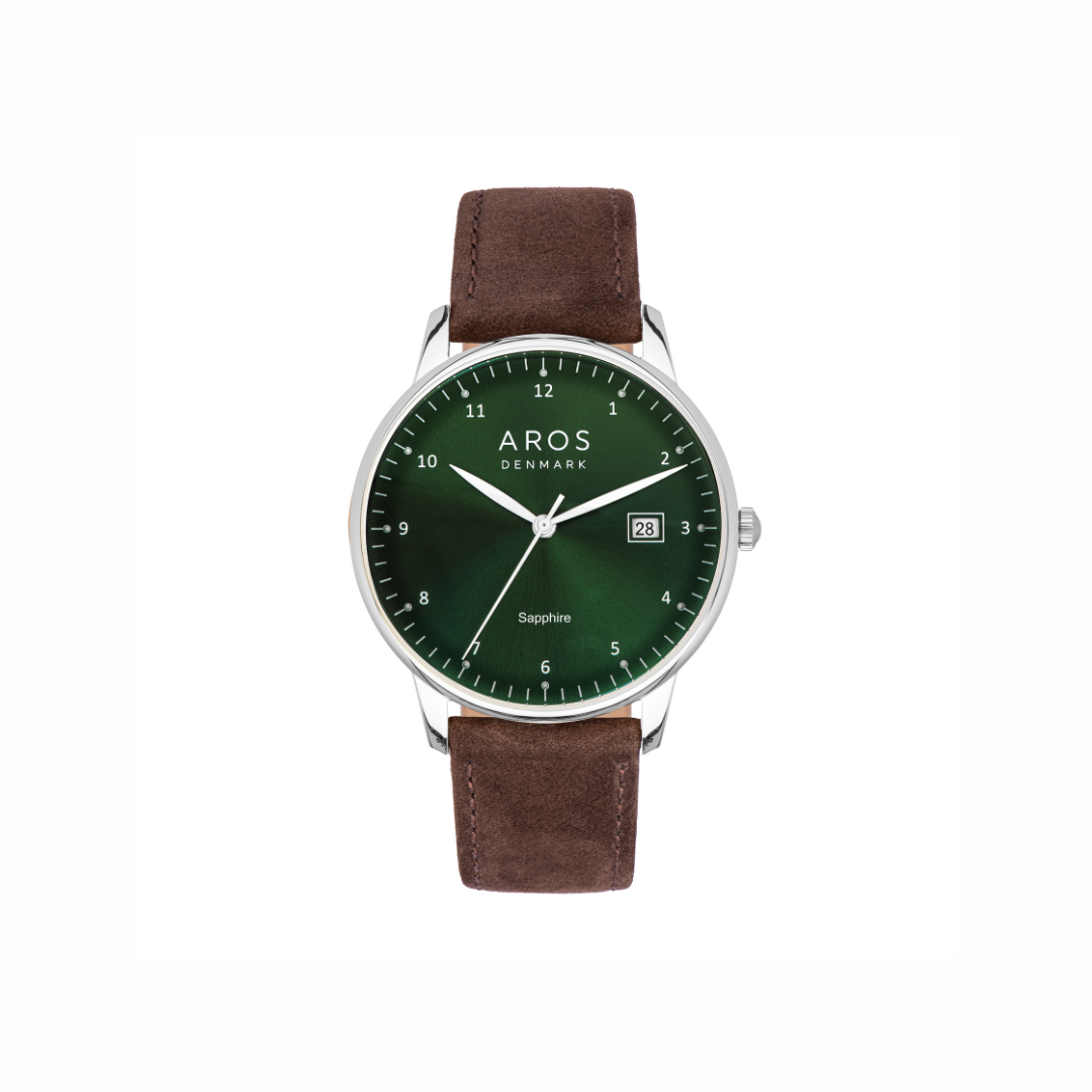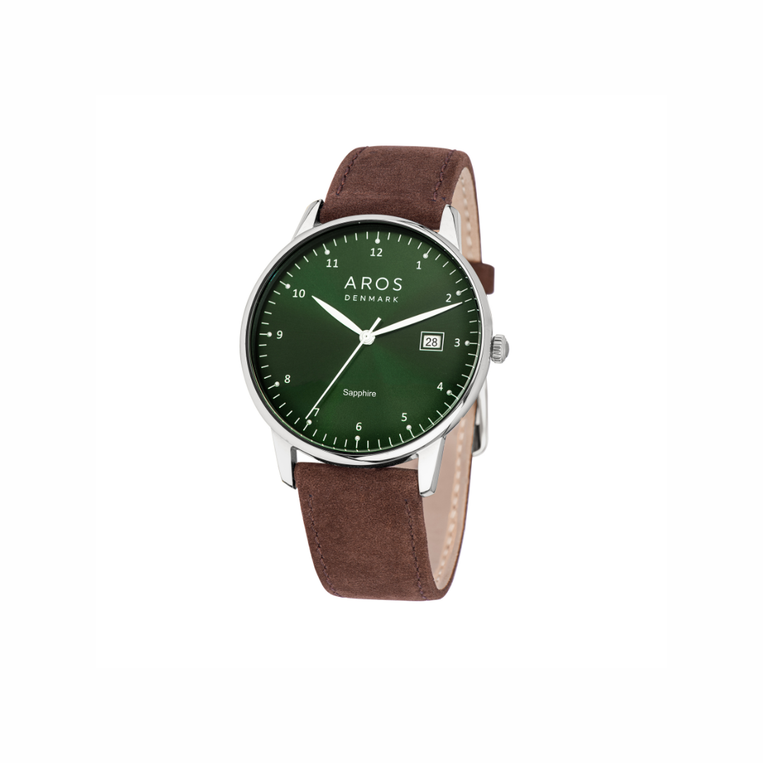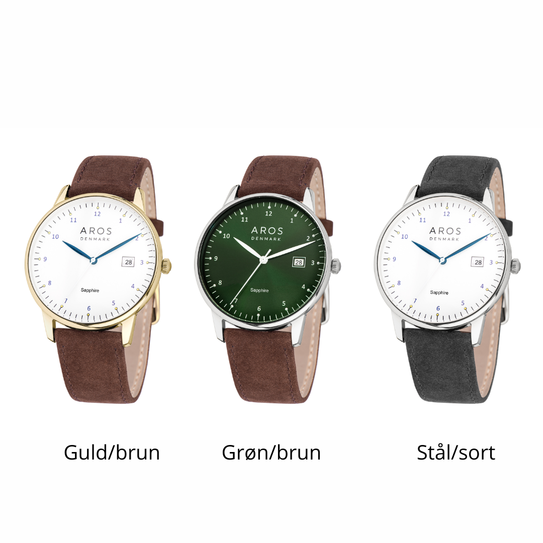 Dette elegante herreur fra AROS kombinerer stil og funktionalitet med sit rå men klassiske læderrem, ridsefaste safirglas og 3 ATM. Uret fås med både brun læderrem og guld double, brun læderrem og stål + grøn urskive samt sort læderrem m. stål. Det har et klassisk analogt design med tydelige markeringer og praktisk datovisning – perfekt til både hverdag og formelle anledninger.