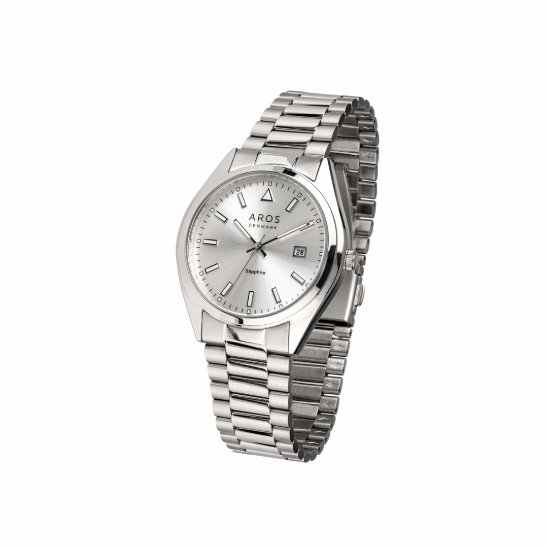 Dette elegante herreur fra AROS kombinerer stil og funktionalitet med sit robuste rustfri stål-lænke, ridsefaste safirglas og vandtæthed op til 5 ATM. Uret fås med både hvid og grøn urskive og har et klassisk analogt design med tydelige markeringer og praktisk datovisning – perfekt til både hverdag og formelle anledninger.