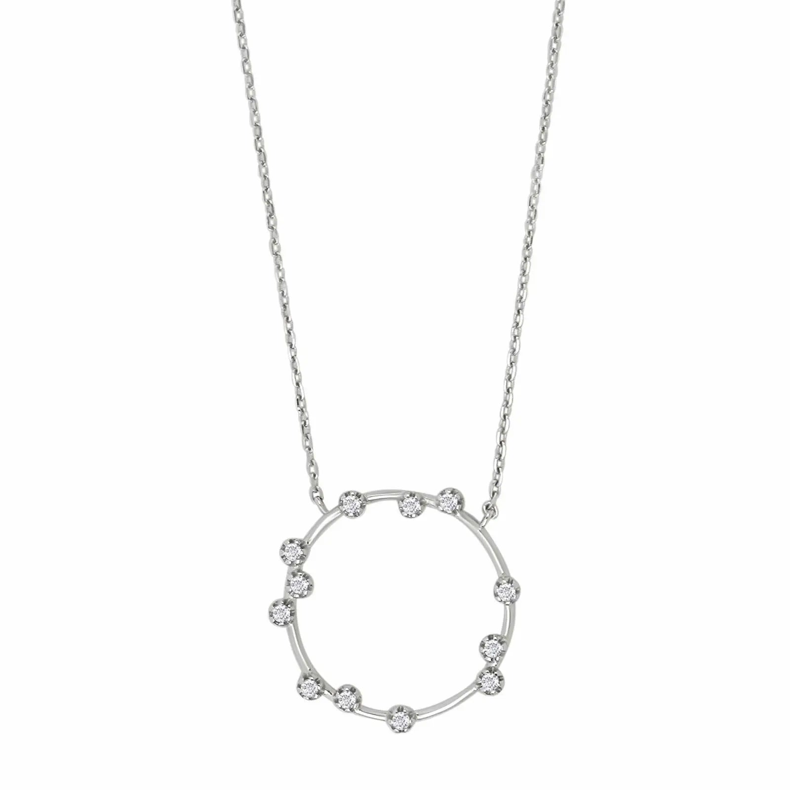 Skab et stilrent og sofistikeret look med denne moderne Joanli Nor halskæde. Halskæden er prydet med et åbent cirkelvedhæng, elegant besat med glitrende hvide zirkonia sten, som giver et eksklusivt og feminint udtryk.