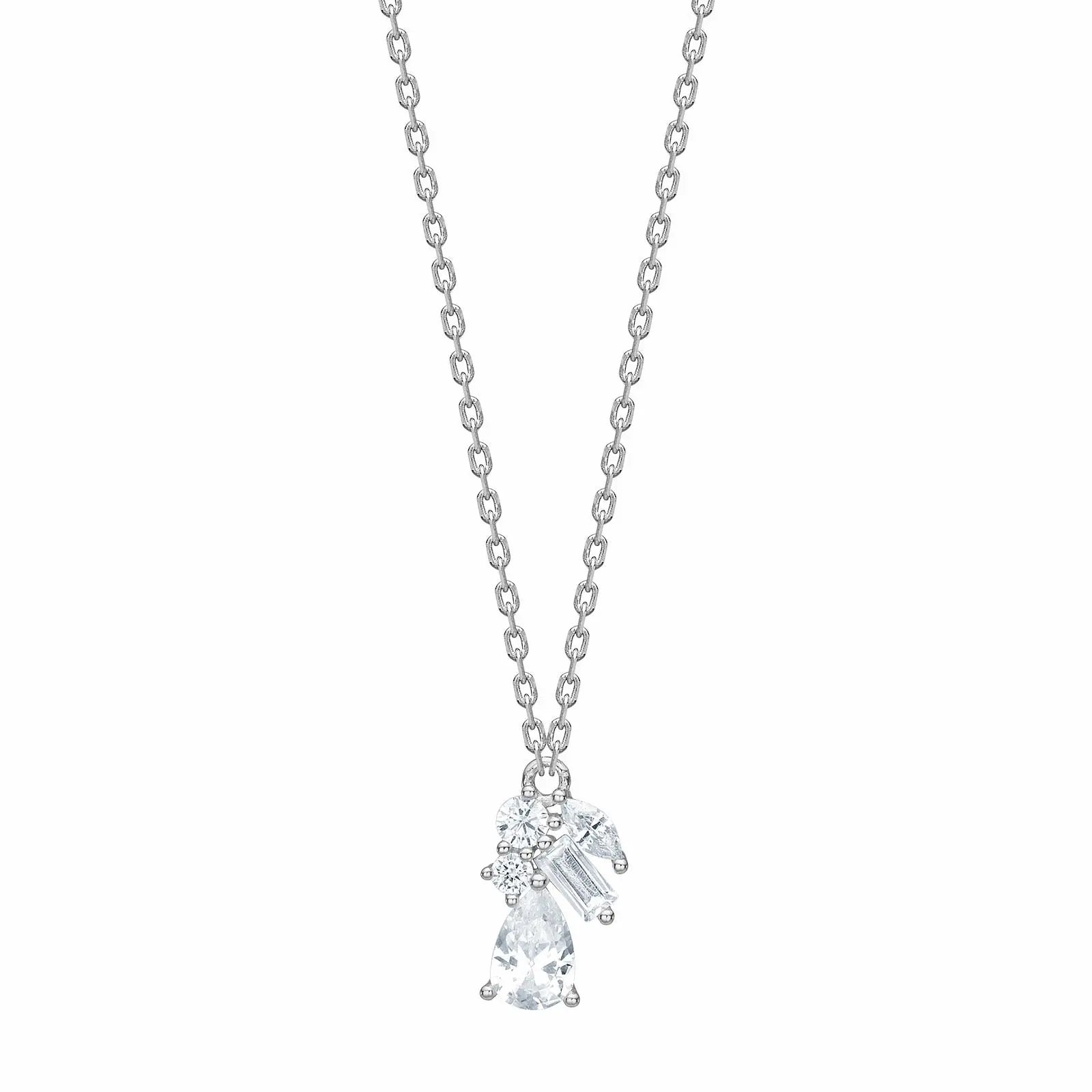 Denne eksklusive Joanli Nor halskæde er et stilfuldt valg til dig, der elsker et sofistikeret look med et strejf af glamour. Halskæden er fremstillet i enten rhodineret eller forgyldt sølv og prydet med et elegant vedhæng sammensat af klare zirkonia sten i forskellige slibninger – herunder dråbeformet, baguette og rund.
