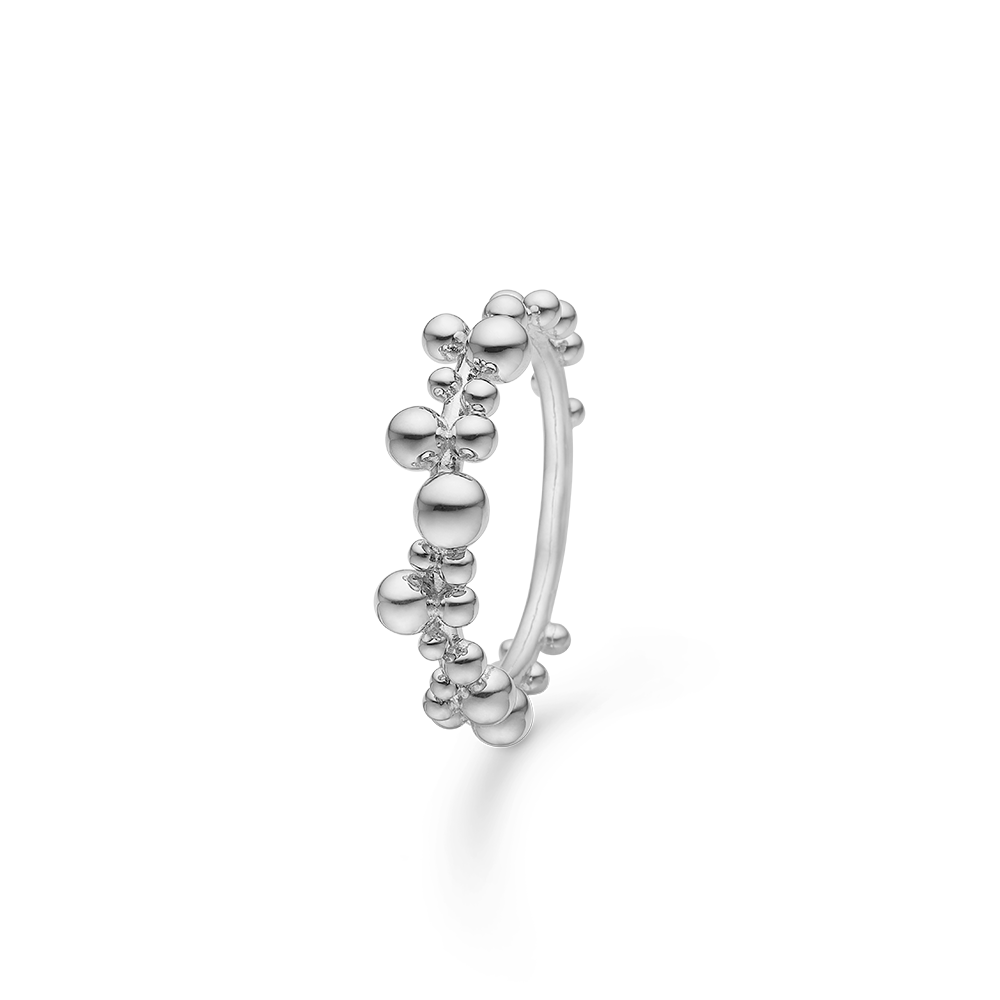 Denne stilfulde sølvring fra danske Mads Z kombinerer legende design med moderne elegance. Ringen er udsmykket med et unikt boblelook i blankpoleret rhodineret sølv, der skaber en dynamisk og iøjnefaldende struktur omkring hele ringen. Små glitrende detaljer mellem boblerne tilfører et diskret strejf af eksklusivitet og finesse.
