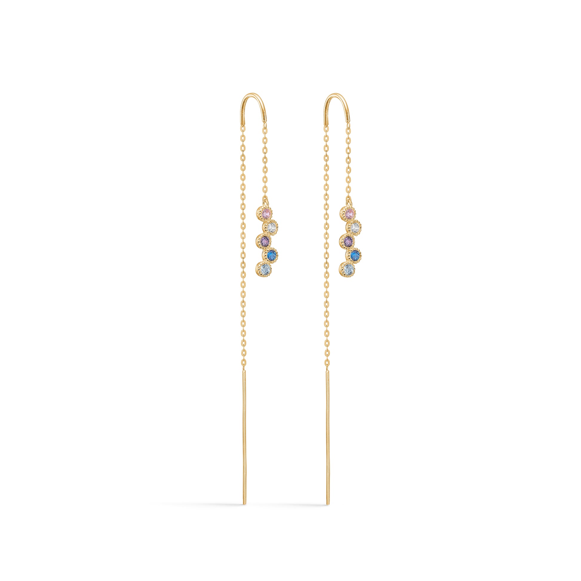 Disse elegante Dido Rainbow trådøreringe fra danske Mads Z er fremstillet i ægte 8 karat guld og pyntet med en smuk kombination af farvede zirkoniasten i regnbuens nuancer. De lange, fine kæder skaber en let og flydende bevægelse, der tilføjer både femininitet og farverig elegance til dit look.