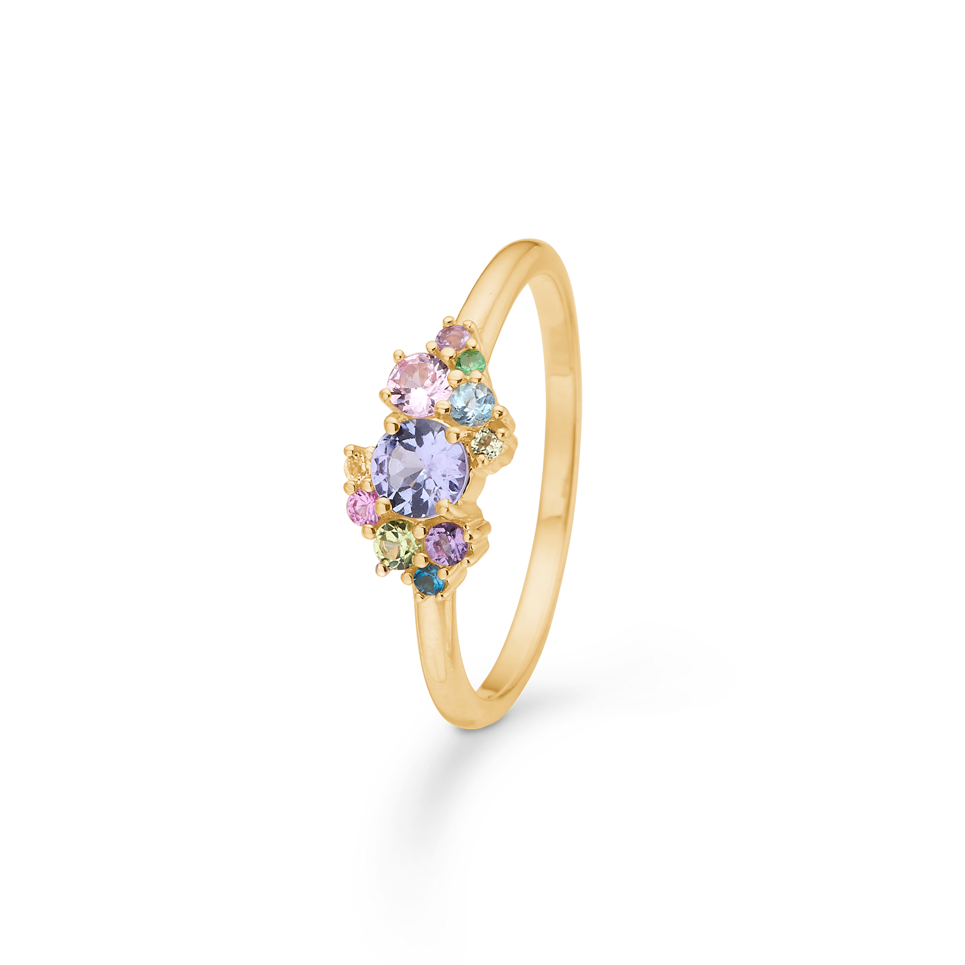 Fremhæv din personlige stil med denne eksklusive 14 karat guldring fra det danske smykkebrand Mads Z. Ringen er udsmykket med en smuk sammensætning af farverige sten i sarte nuancer af lilla, blå, grøn, lyserød og gul – perfekt til dig, der elsker et feminint og unikt look.