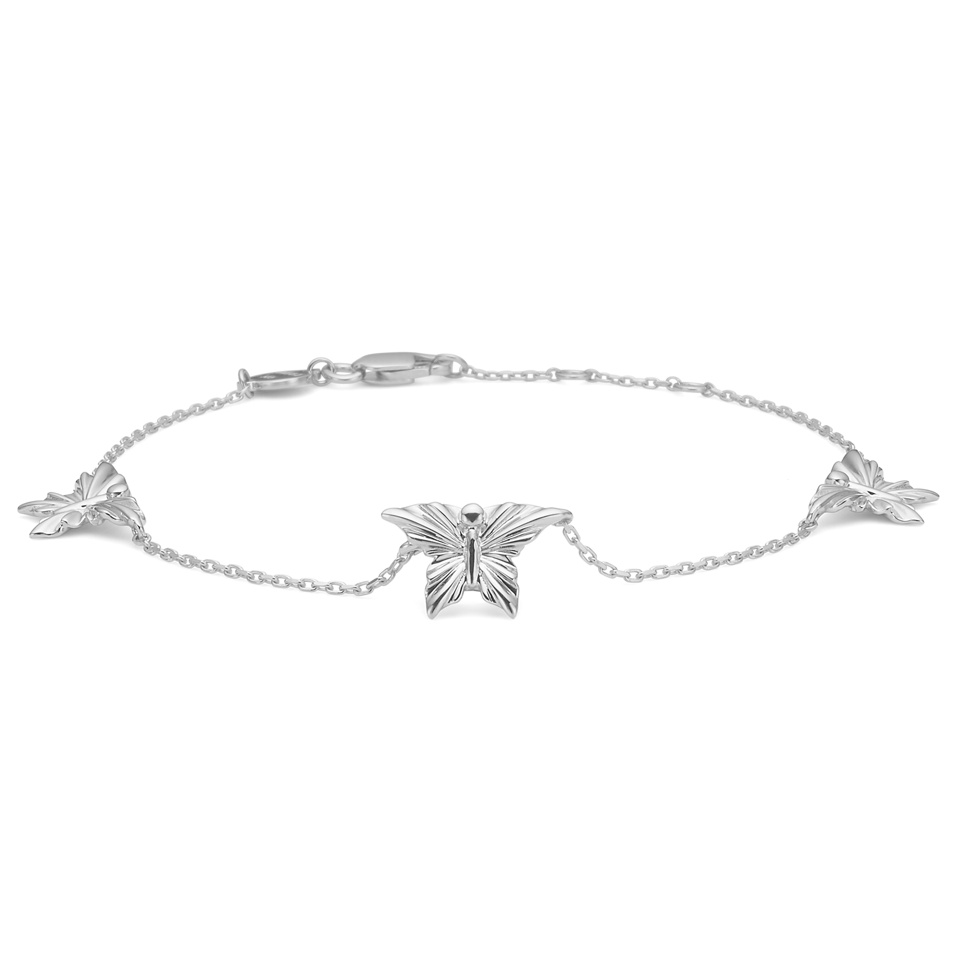 Let, elegant og fyldt med symbolik – dette smukke sølv armbånd fra danske smykkedesigner Mads Z er dekoreret med tre detaljerede sommerfugle, der skaber et harmonisk og feminint udtryk. Armbåndets fine kæde og blankpolerede vedhæng i rhodineret sterling sølv tilfører et strejf af ynde og forvandling.