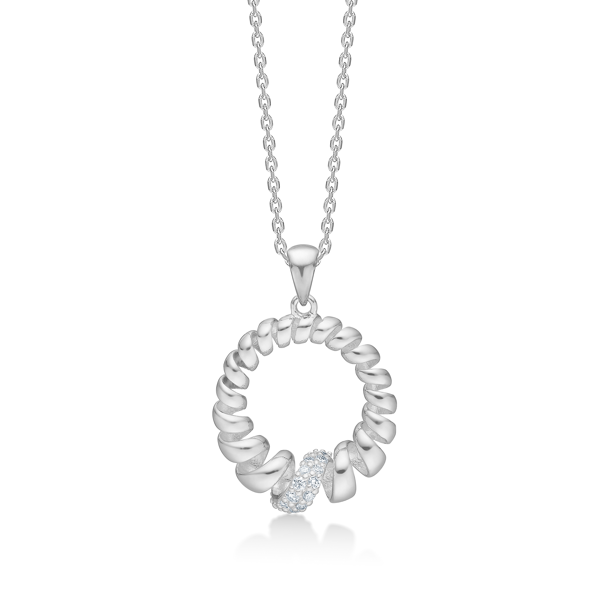 Fuldend dit look med denne moderne og elegante sølv halskæde fra danske Mads Z. Vedhænget har et iøjnefaldende swirl-design i cirkelform, hvor snoede sølvelementer danner en harmonisk ring. Det hele fuldendes af en skinnende detalje med indfattede hvide topaser, der tilføjer et strejf af eksklusiv glans.
