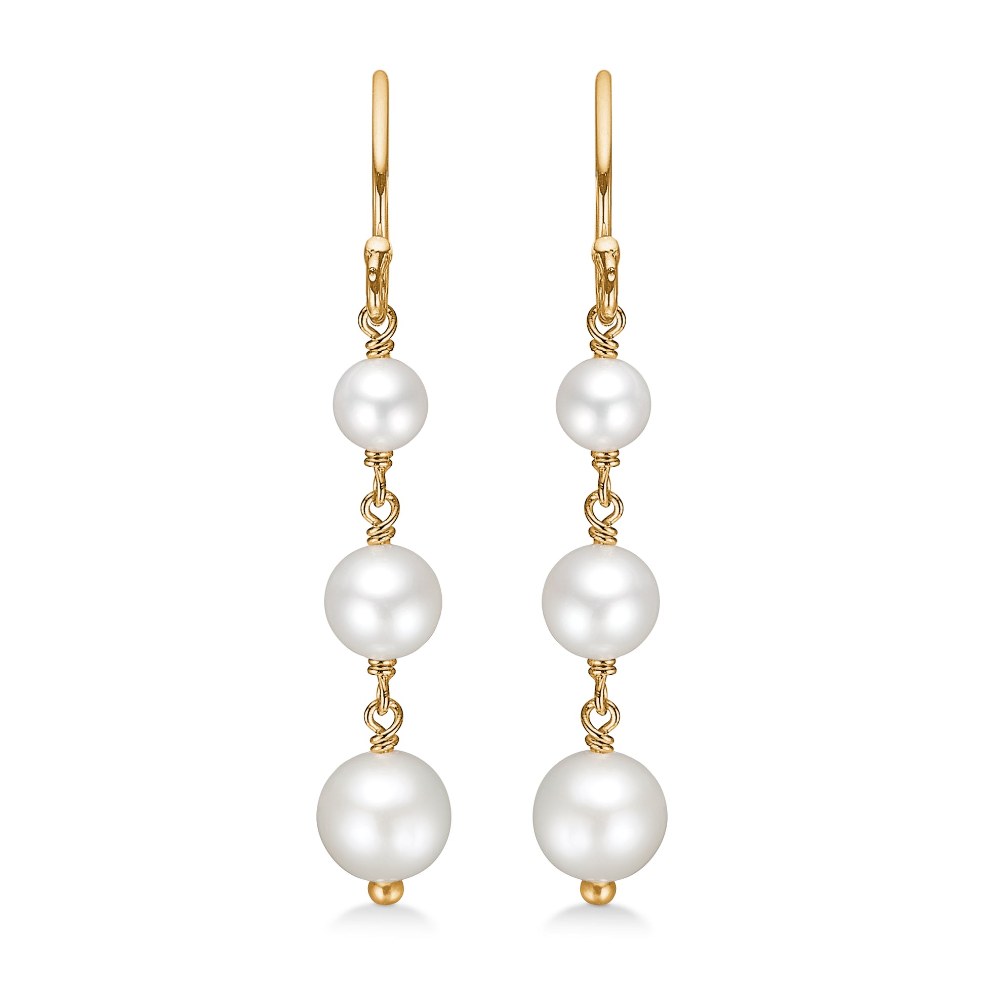 Disse elegante øreringe i 14 karat guld er prydet med tre smukke hvide kulturperler i stigende størrelse, hvilket skaber et harmonisk og sofistikeret udtryk. Det klassiske design med perler i forløb giver øreringene et let og feminint look, som er perfekt til både hverdag og festlige lejligheder. Perlerne måler mellem 5-7 mm.
