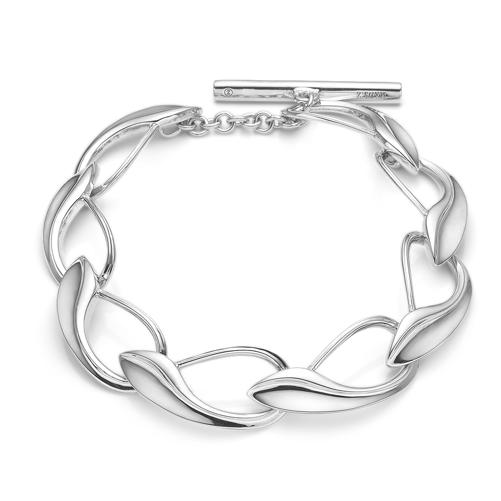 Et armbånd med et elegant twist. Dette stilfulde sølv armbånd fra danske Mads Z er designet med organiske, bølgende led, der giver et feminint og moderne udtryk. Smykket er fremstillet i rhodineret sterling sølv, som sikrer en flot glans og lang holdbarhed.