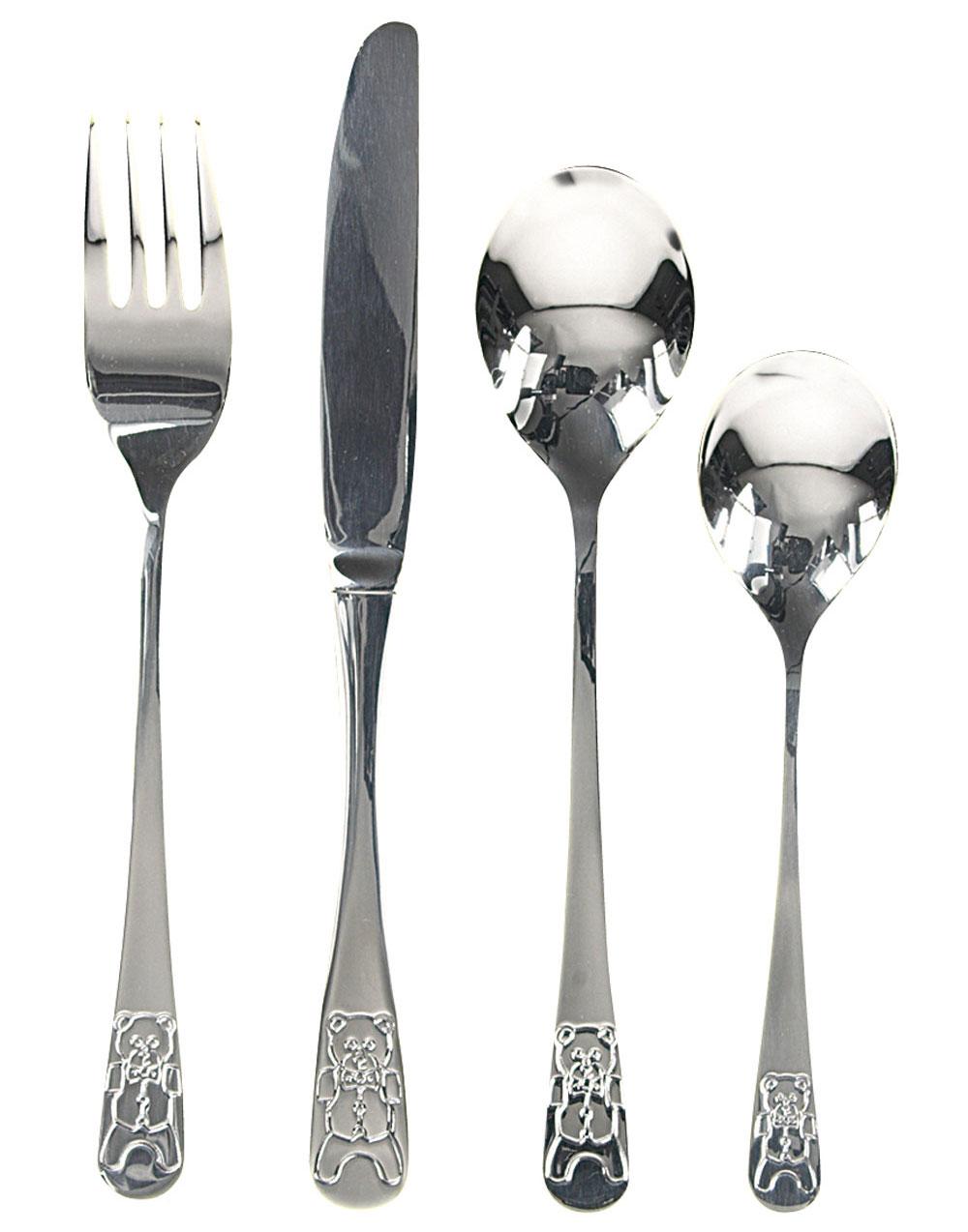 Giv en uforglemmelig gave med dette søde bamse-bestik i rustfrit stål, dekoreret med nuttede små bamsemotiver. Dette firesæt består af kniv, gaffel, spiseske og teske, alle designet til små hænder og lavet i høj kvalitet.