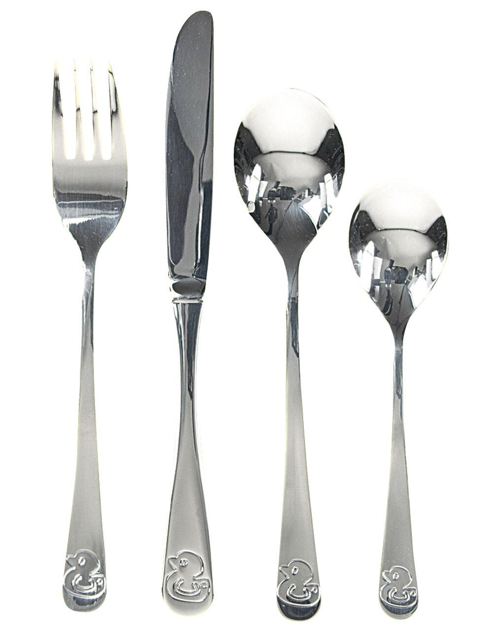Forkæl en lille én med dette charmerende børnebestik i rustfrit stål, prydet med et sødt andemotiv på skaftet. Sættet består af kniv, gaffel, spiseske og teske, designet specielt til små hænder, så barnet får en god start ved spisebordet.