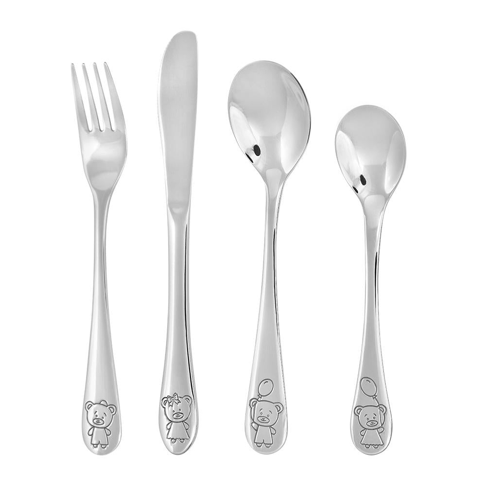 Dette charmerende børnebestik i rustfrit stål prydet med søde bamsemotiver er den ideelle dåbsgave, der kombinerer kvalitet, funktionalitet og personlig betydning. Sættet består af gaffel, kniv, spiseske og teske – alle i børnevenlig størrelse og form.