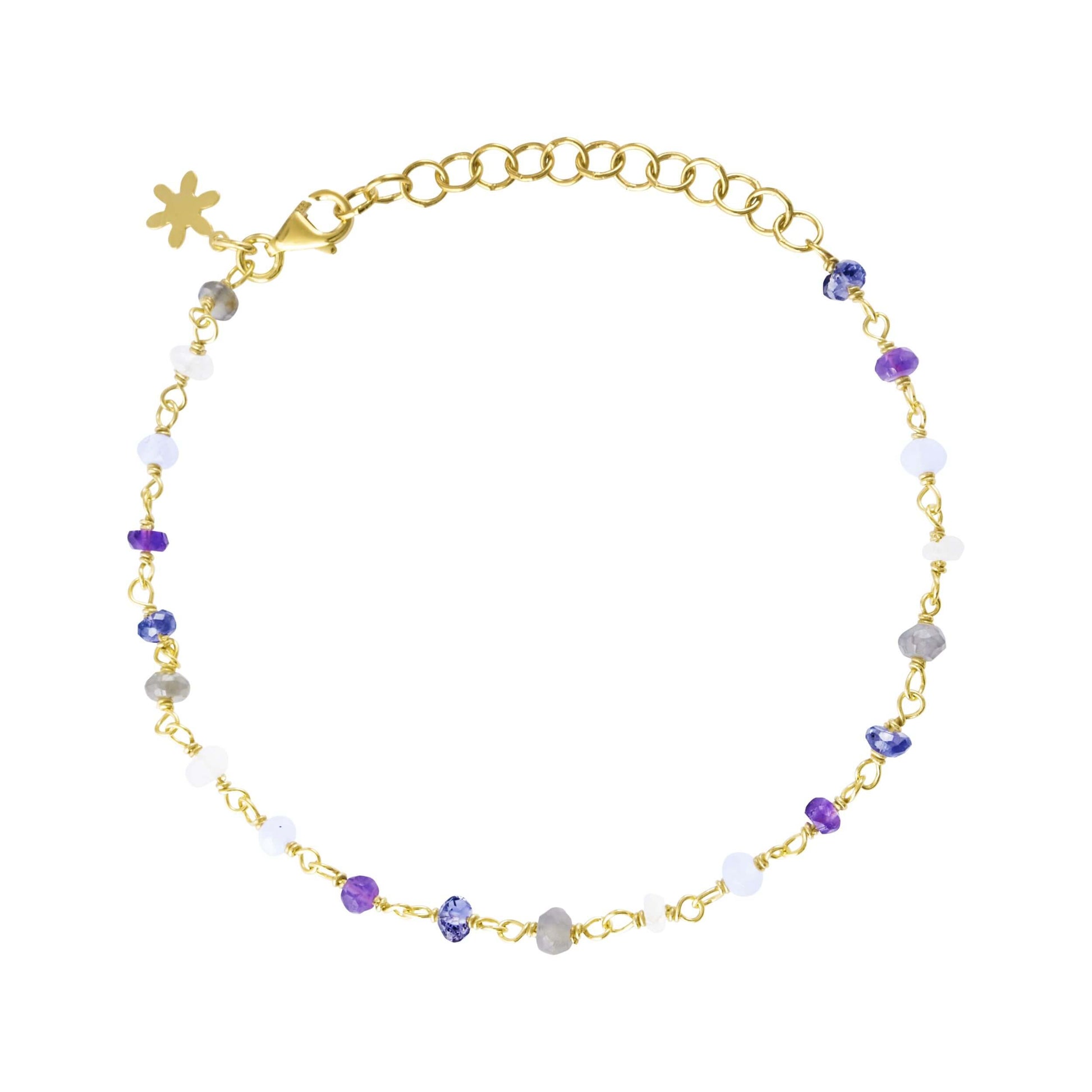 Armbåndet er udført i forgyldt sølv og prydet med delikate, facet-slebne ædelstene: ametyst, calcedon, grå månesten, hvid månesten og iolite. Kombinationen af de bløde farver og det eksklusive design skaber et elegant udtryk, der passer perfekt til både hverdag og fest.