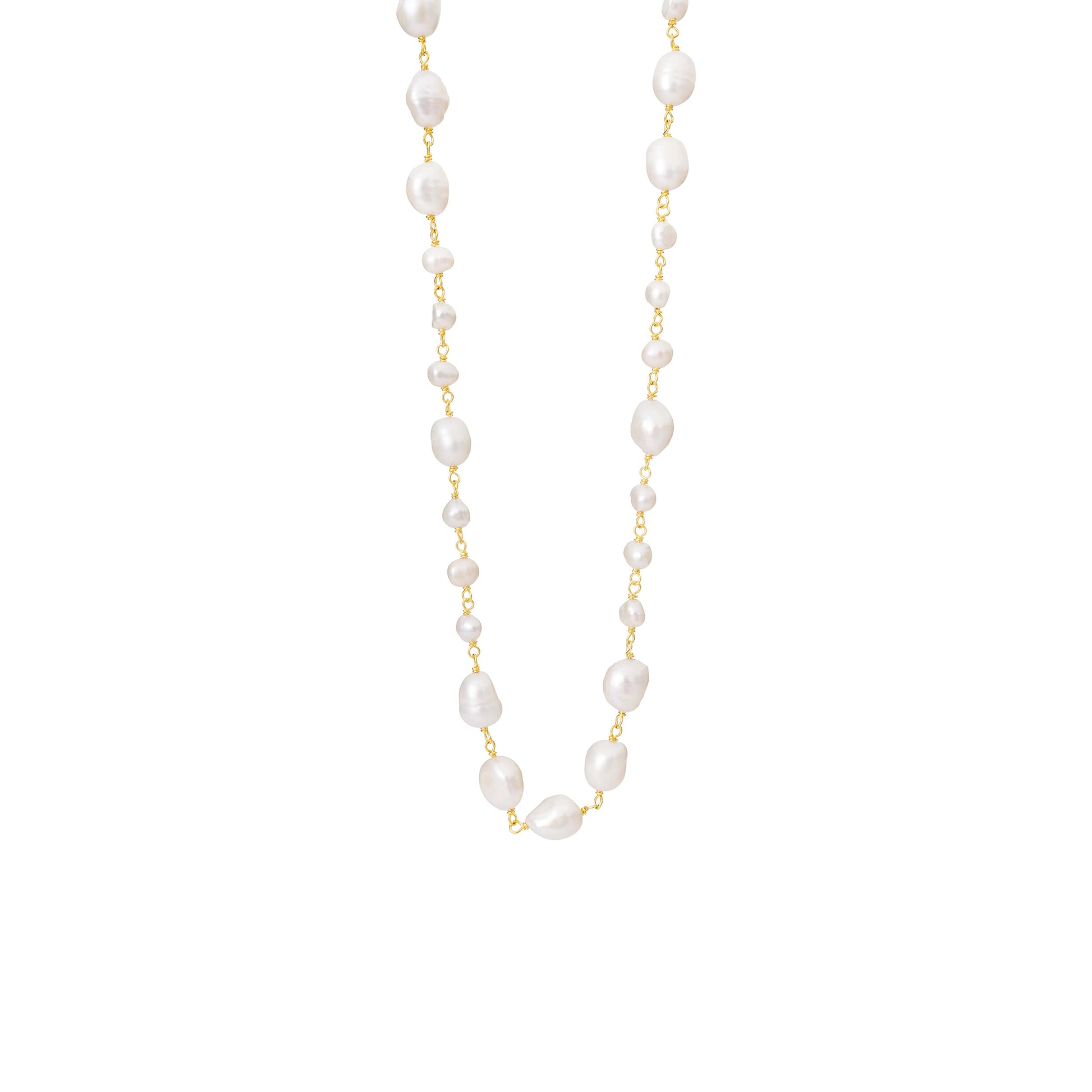 Halskæden er fremstillet i forgyldt sterlingsølv (925s) og prydet med blandede barokke hvide ferskvandsperler, som giver hvert smykke et unikt og organisk udtryk.