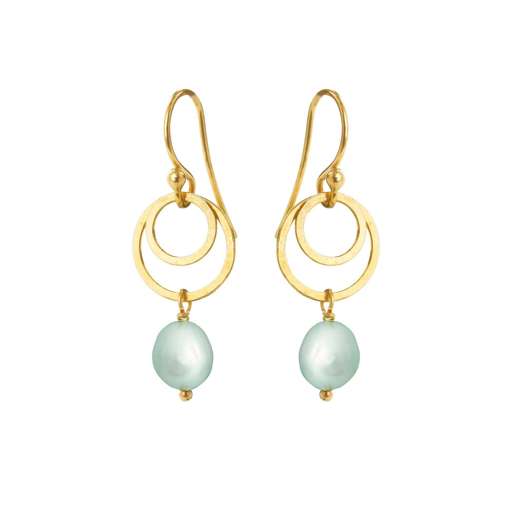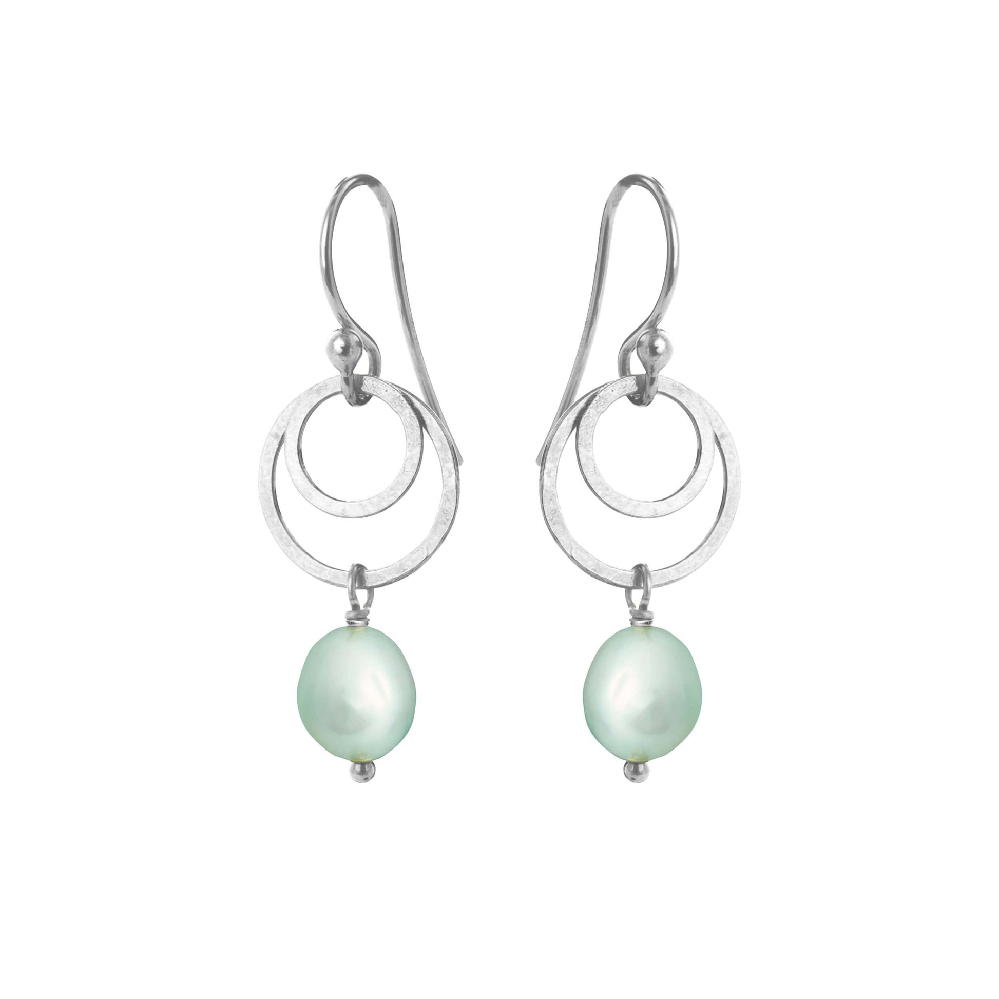 Elegant og tidløs øreringe fra Susanne Friis Bjørner, designet i sterlingsølv og pyntet med to små ringe, der fremhæver en smuk mintgrøn ferskvandsperle (5-6 mm, oval).