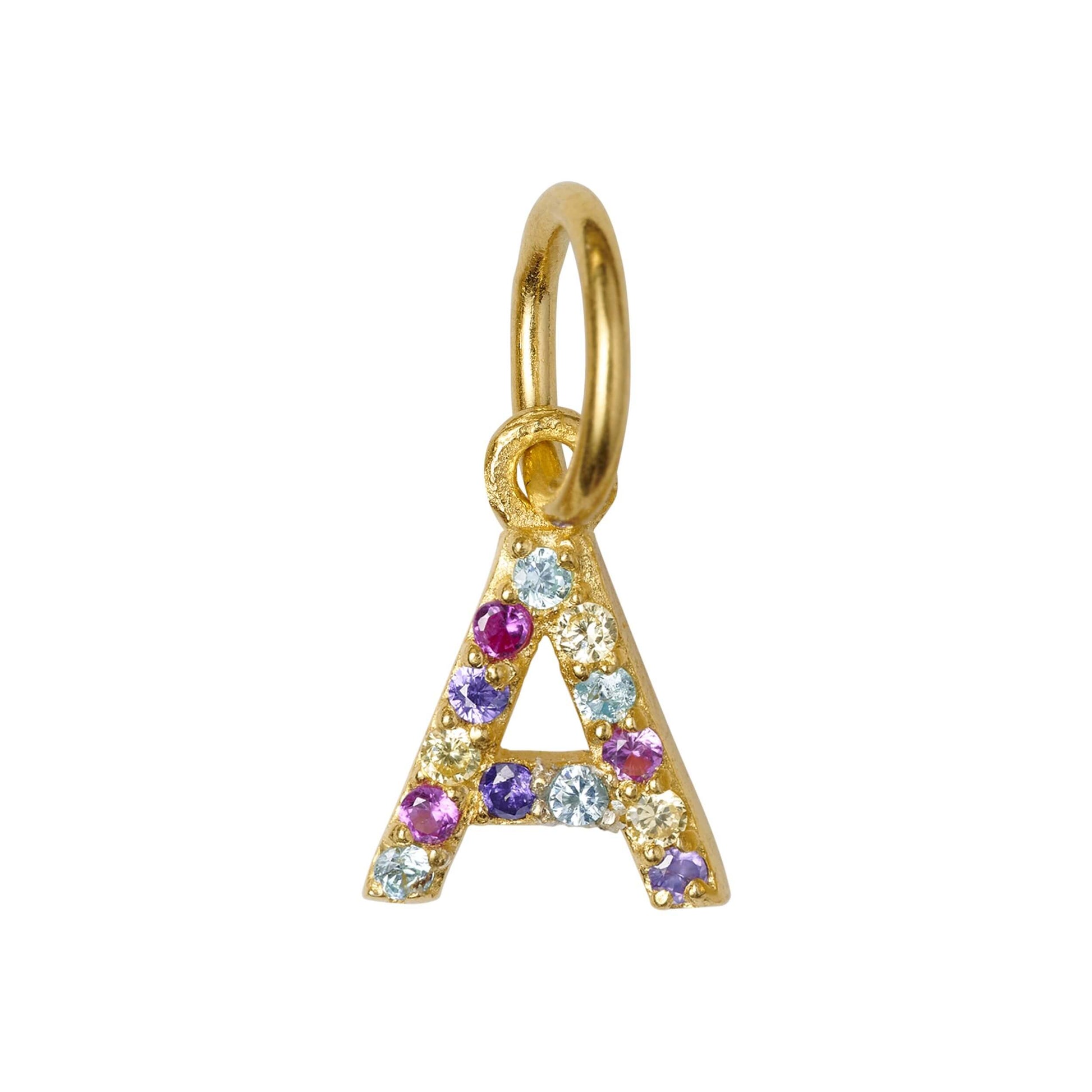 Susanne Friis Bjørner vedhæng – forgyldt Sølv med multifarvede zirkoner, bogstav A